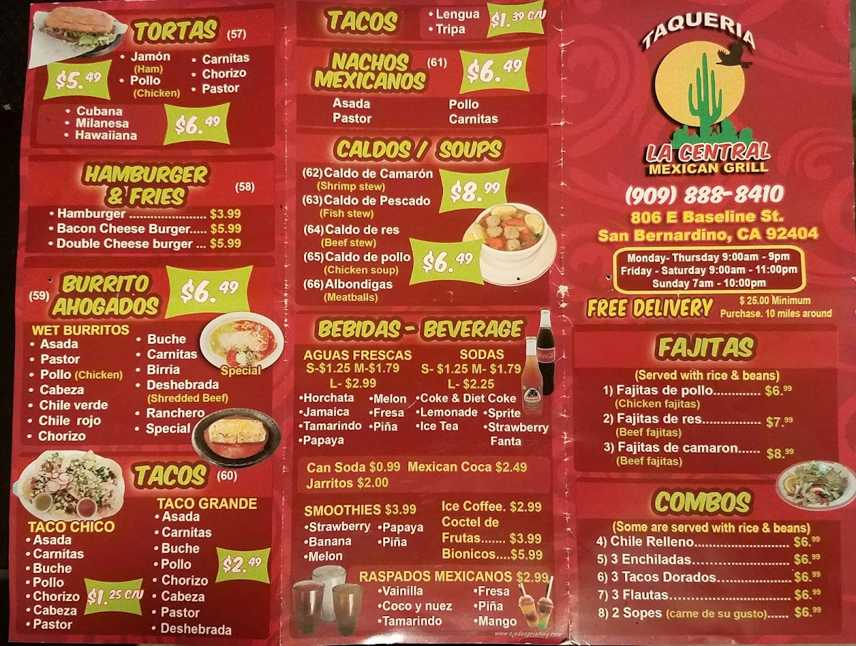 If you’re craving authentic Mexican flavors, Taqueria La Central Mexican Grill Menu is where you need to be. Located at 806 E Baseline St in San Bernardino, CA, this cozy spot brings you everything you love about Mexican cuisine, made with fresh, high-quality ingredients. Whether you're in the mood for sizzling fajitas, juicy tacos, or mouthwatering burritos, the menu has something to satisfy every craving.